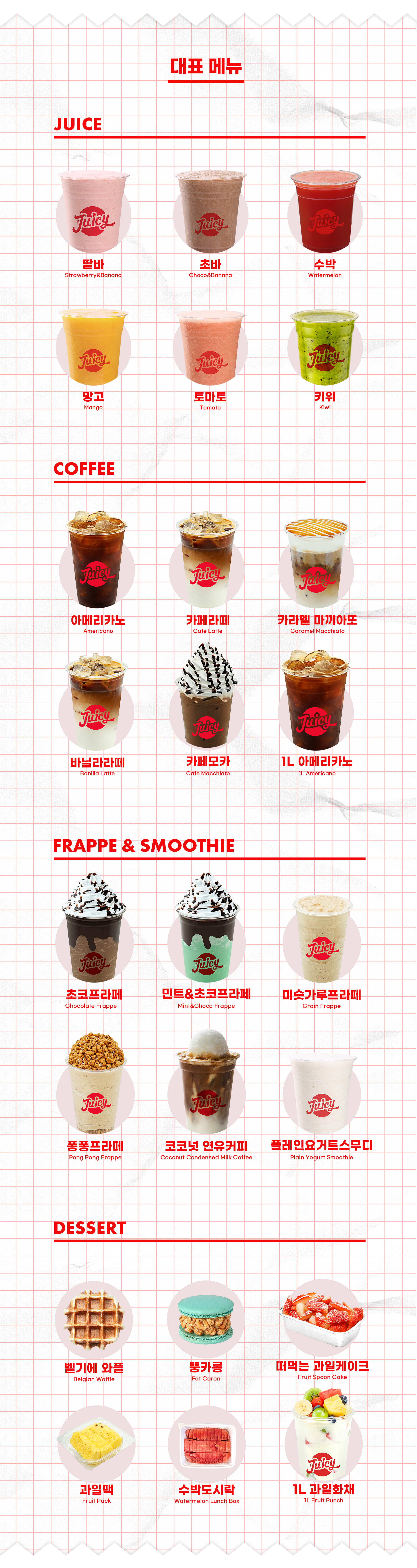 원두 로스터리[커피], 쥬씨[주스], 와피[와플], 차얌[밀크티]의 핵심 메뉴만 쏙쏙!